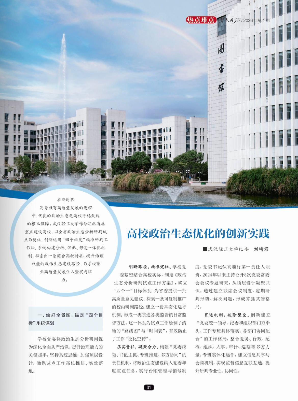 驻校纪检监察组组长、校纪委书记刘靖君在《楚天风纪》发表署名文章:高校政治生态优化的创新实践